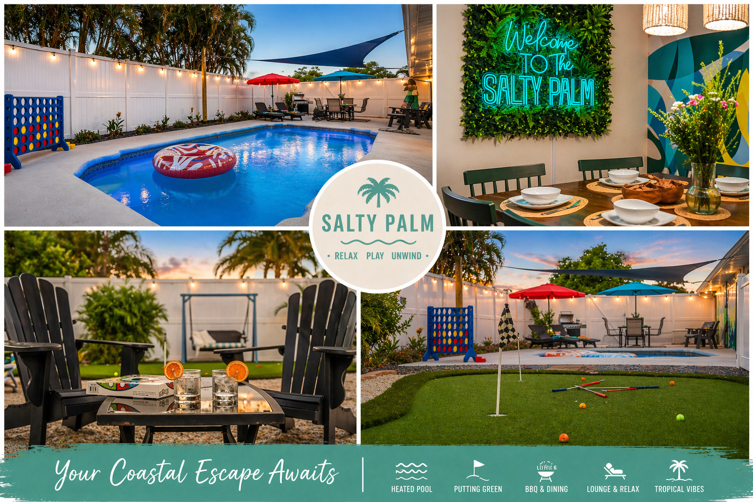 Upcoming Local Events: 🎶 Music in the Park 🗓 Fridays, April 3 – May 22, 2026 ⚾ PBR East Cup @ IMG Academy 🗓 June 11–14, 2026 🎶 Coquina Beach Market (Summer Season) 🗓 Sundays & Wednesdays, June–August 2026 🎨 Bradenton Riverwalk Summer Art Walks 🗓 Select Saturdays, June–August 2026 ⚽ IMG Academy Summer Soccer Camps & Tournaments 🗓 Various dates throughout June–August 2026 🇺🇸 Anna Maria Island 4th of July Celebration & Fireworks 🎆 Bradenton Riverwalk 4th of July Fireworks 🗓 July 4, 2026 🎣 DeSoto Heritage Festival Fishing Tournament 🗓 July 18–19, 2026 🎾 IMG Academy International Tennis Championship 🗓 August 2026 (dates vary by draw/event)  🏐 IMG Academy Volleyball Classic 🗓 August 2026  ⚽ IMG Academy Fall Soccer Events & Camps 🗓 Various dates throughout August–September 2026  🎨 BAM!Fest (Bradenton Art & Music Festival) 🗓 September 2026 — date TBD  🎾 IMG Academy Fall Tennis Events 🗓 Various dates throughout September 2026  🥎 IMG Academy Softball Camps 🗓 Various dates throughout July–September 2026 Welcome to The Salty Palm - a private, family-friendly retreat just minutes from Anna Maria Island. Enjoy your own heated pool, backyard games, and a fully loaded game room, all in a quiet neighborhood perfect for unwinding after beach days. Designed for families and groups who want fun, comfort, and space to relax, this home makes your stay easy and memorable from the moment you arrive. The Salty Palm is a single-level, family-friendly home designed for comfort, fun, and memorable Florida stays. Guests love the resort-style backyard, built-in entertainment, and convenient location close to beaches, nature, and dining. 🛏️ Comfortable Sleeping for the Whole Group • Sleeps up to 8 | 3 Bedrooms + Office/Den | 2 Full Baths • Primary Suite: King bed + private ensuite • Guest Bedroom: Queen bed • Bunk Room: Twin-over-Full bunk + extra twin • Den / Office: Daybed + desk (great for remote work) All bedrooms include blackout curtains, smart TVs, and comfortable bedding. 🏖️ Resort-Style Outdoor Living • Private heated pool (no extra fees) • Mini-golf putting green • Bocce ball court • Giant Connect 4 & cornhole • Fully fenced backyard for privacy • BBQ grill, outdoor dining & poolside loungers 🎮 Indoor Entertainment • Dedicated game room • Ping pong & air hockey • Foosball • Retro arcade games • 5 Smart TVs (largest 65”) 🍽️ Kitchen, Dining & Living • Fully equipped chef’s kitchen • Coffee bar (drip + Keurig) • Dining table for 8 + peninsula seating • Cozy living room with sectional, games & blankets ✔ Family-Friendly Extras • Pack ’n Play & high chair • Children’s dishes & cups • Optional pool alarm • Beach chairs, towels, tent, coolers & toys 🚗 Parking & Convenience • Private driveway • Parking for up to 4 vehicles + boat space • High-speed Wi-Fi • Washer & dryer • Stress-free Self Check-in Guests enjoy more space, privacy, and amenities than island condos — with easy access to everything the area has to offer!
